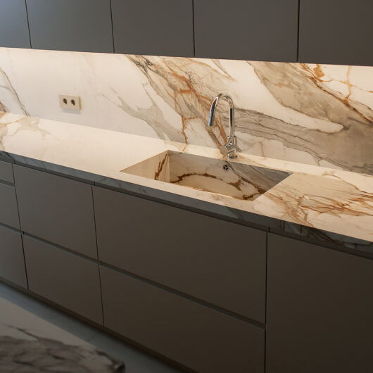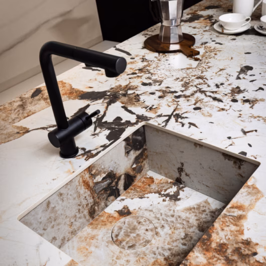 Encimeras de cocina con fregadero integrado, encimeras de baño con lavabos integrados o sobre encimera, encimeras de gran formato con acabados cerámicos, encimeras modulares para cocinas exteriores, encimeras personalizadas para espacios de trabajo, encimeras para áreas comerciales, soluciones híbridas para restaurantes y bares.