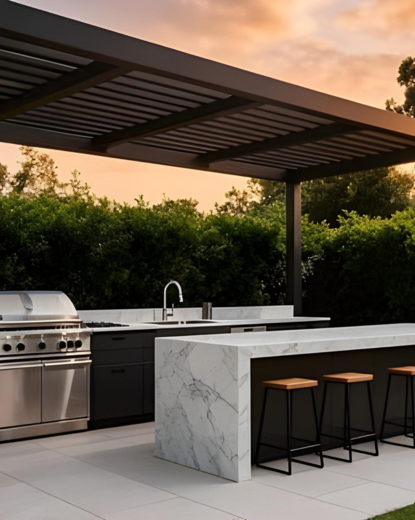 Pero la resistencia, por sí sola, no explica su protagonismo creciente. Lo que verdaderamente está redefiniendo las cocinas exteriores es la posibilidad de mantener una continuidad visual entre interior y exterior. Si el salón dialoga con la cocina y esta, a su vez, se abre al jardín, resulta coherente que el lenguaje material sea el mismo.